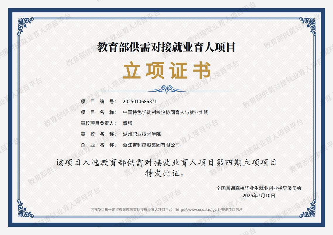 教育部供需对接就业育人项目是落实中央、国务院“稳就业”“保就业”决策部署的关键举措。该项目旨在搭建精准高效的校企对接平台,推动学院人才培养与就业有机联动,为高校学生创造优质实习实践机会,有效提升学生职业素养和就业竞争力。学院携手浙江吉利控股集团以“中国特色学徒制”为核心载体,将在项目建设期内,共同遵循“优势互补、资源共享、互惠双赢、共同发展”的校企合作机制,建设教师队伍,共建科研合作、人才资源共享平台。共同进行人才培养相关的课程教学、科技研发、项目合作、技术成果转化、学生就业创业等。