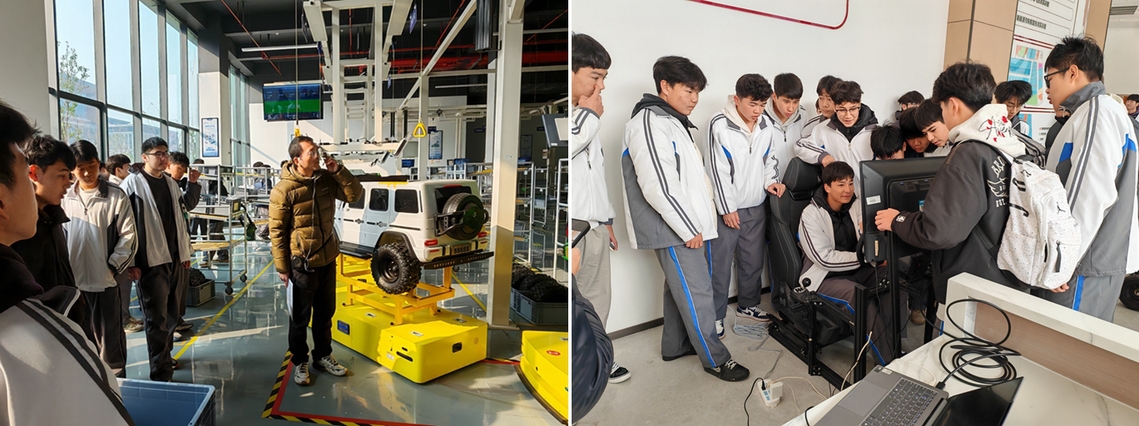 随后,同学们开启了沉浸式实操体验与实地参观环节:先分组参与电动卡丁车试驾、模拟驾驶等实操项目,切实提升了对专业的兴趣;再先后走进巴哈造车工坊、四大工艺模拟流水线、各专业实训室及虚拟仿真中心参观学习,让来访学子深刻体会到高职阶段专业学习的实操导向与技术前沿性。